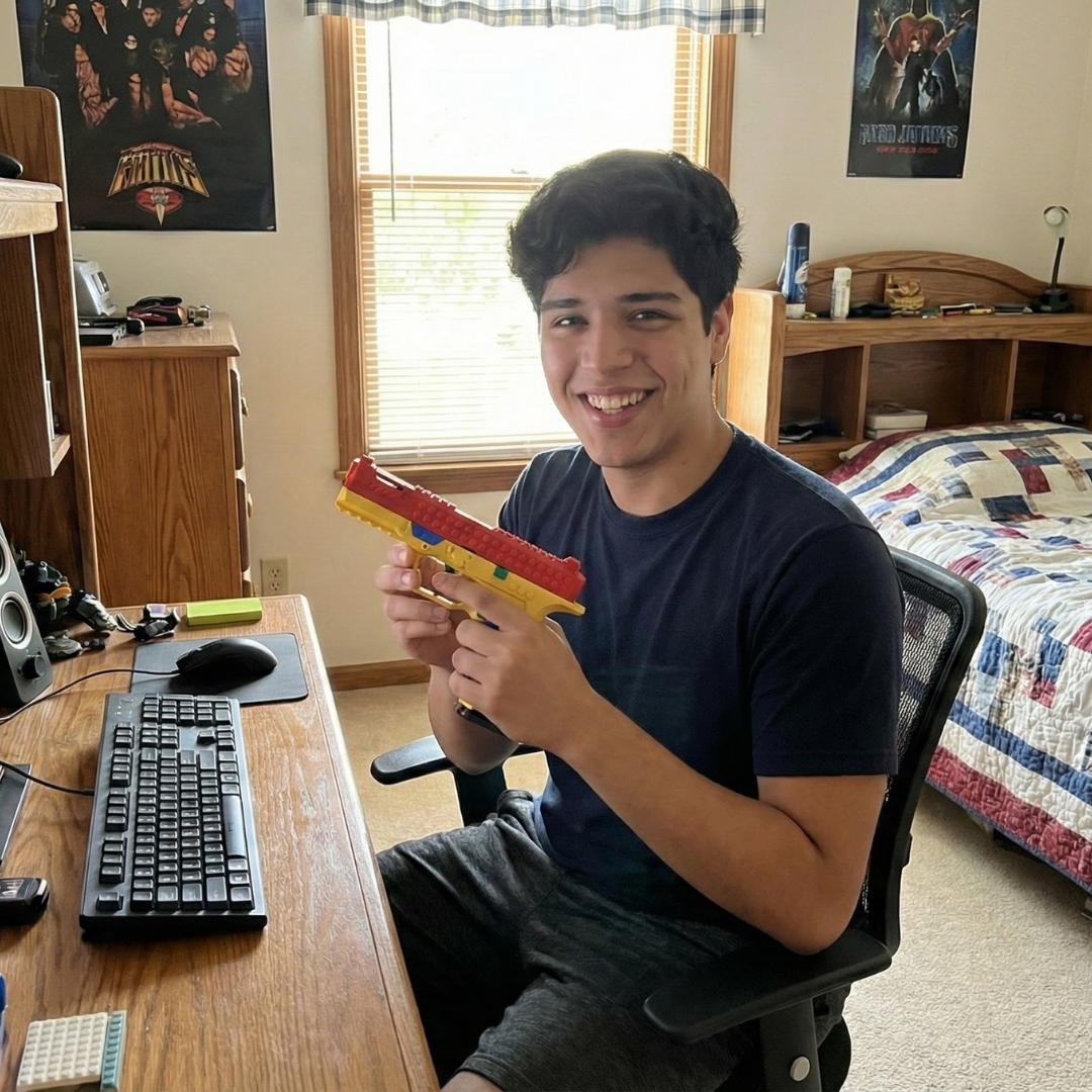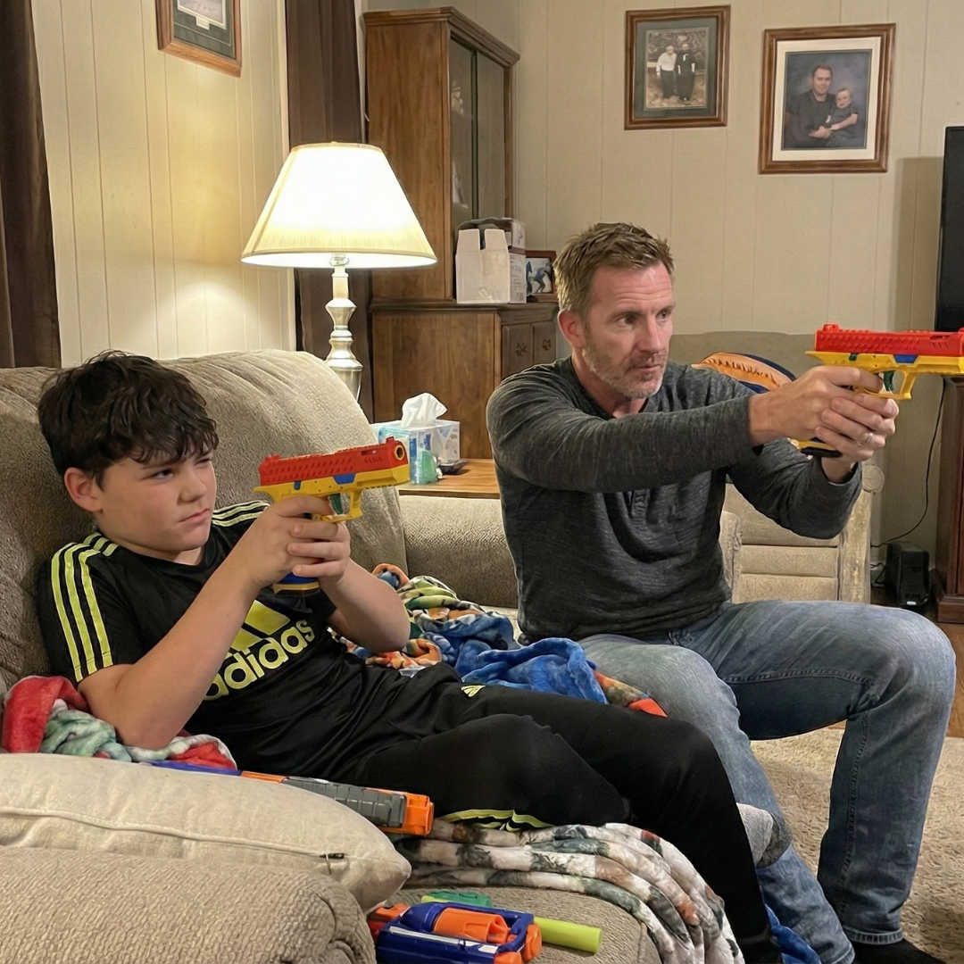 Yes. It’s a lightweight toy blaster designed for safe indoor use. It does not fire real projectiles and has no sharp edges, making it suitable for home use or desk display